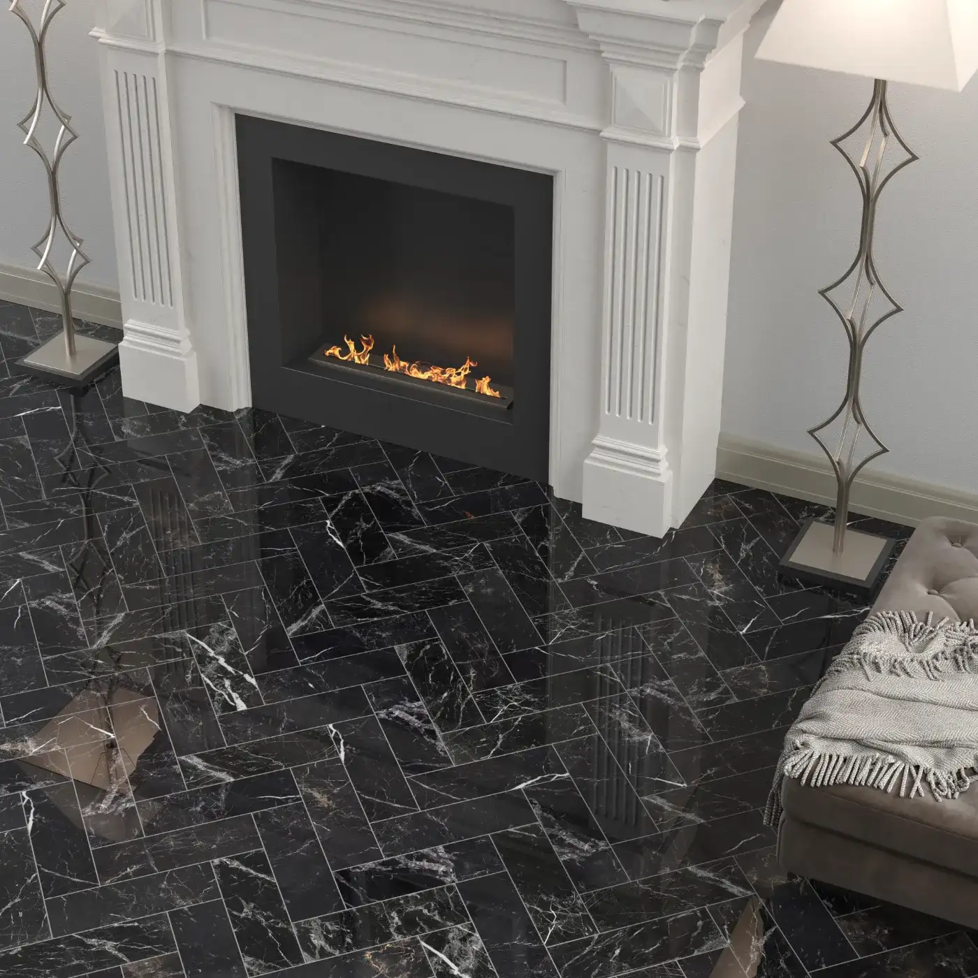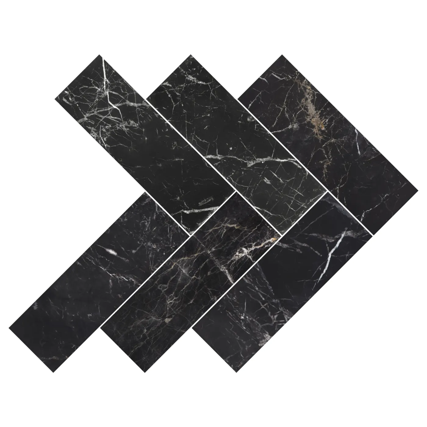 The St Laurent marble really is second to none. This deep black colour scheme mixed with bold white veining’s and subtle yellow markings creates beauty that is bound to amaze whoever sets eyes upon it. Not only would this marble look great mixed with warm lighting in a luxury bathroom, but its look can also be show stopping in many commercial areas such as offices and showrooms. Designing a high-end restaurant that needs to stand out from the crowd? The St Laurent is the perfect choice to get customers talking. Here you will see our St Laurent tiles in the increasingly popular herringbone layout to create a classic lay out with a modern and extravagant luxurious tile.